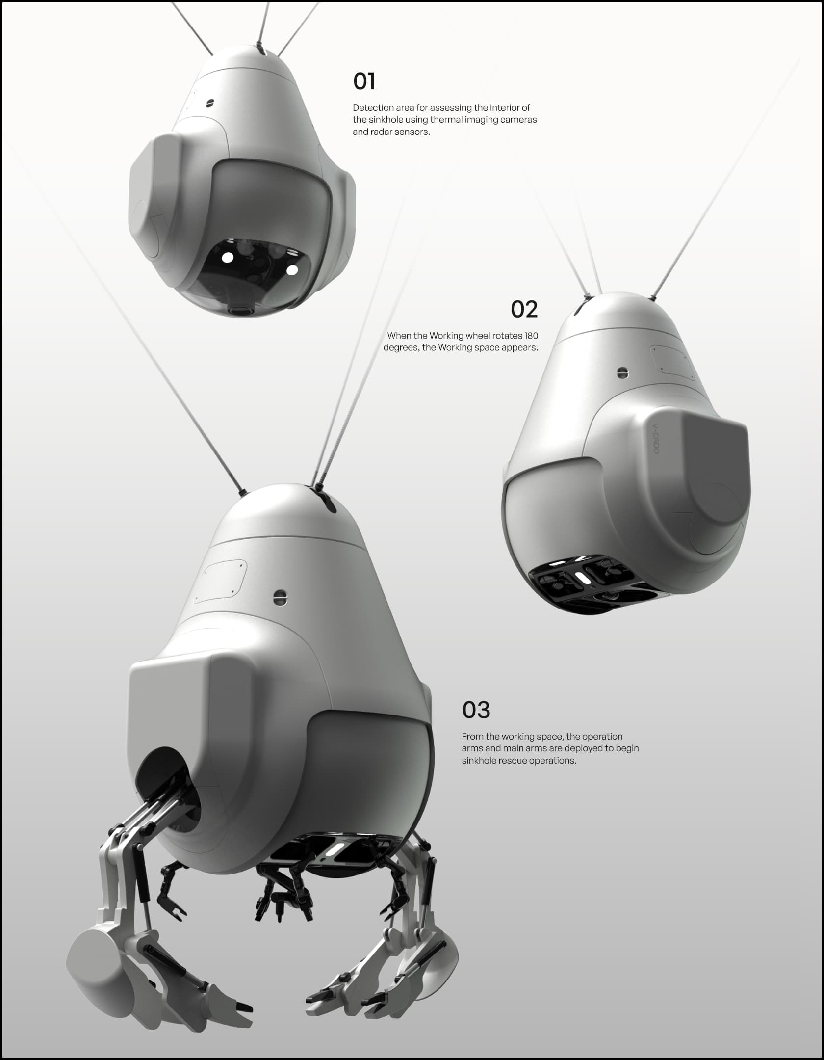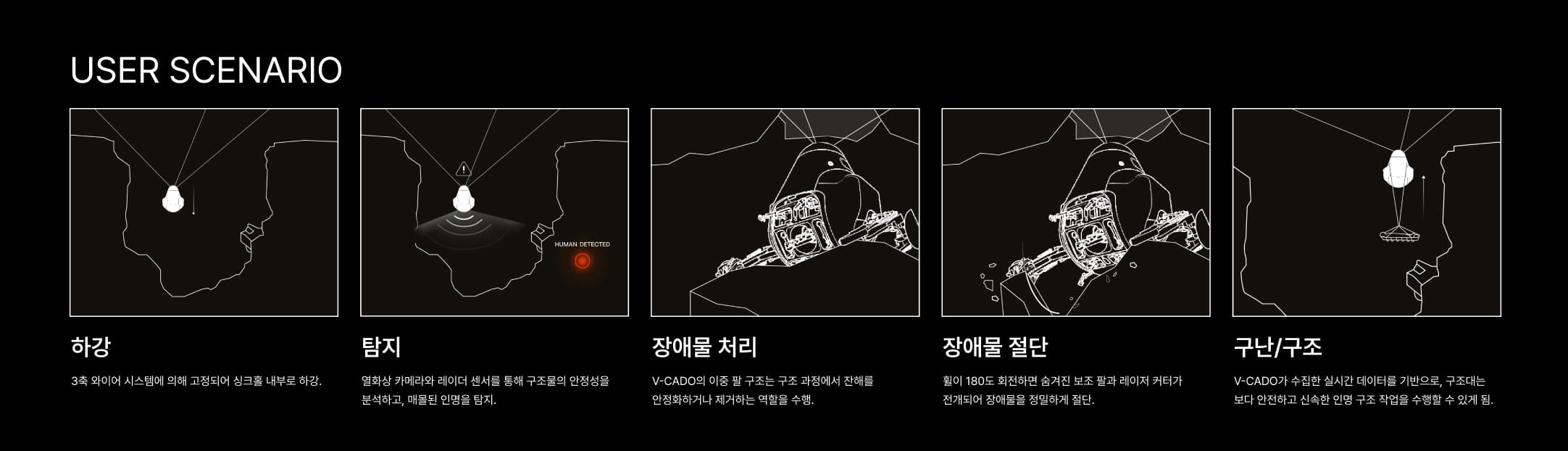 이 지점에서 싱크홀 초기 대응 구난 로봇 V-CADO를 제시한다. 사고 직후 인간 대신 가장 먼저 투입되어, 인명을 파악하고 지형을 맵핑하며 필요시 툴을 사용해 최적의 구조 상황을 만든다.